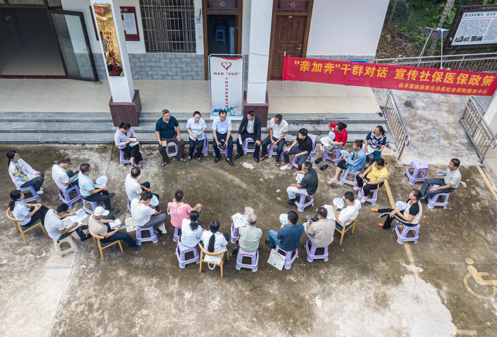 7月16日,在海南省保亭黎族苗族自治縣響水鎮合口村拍攝的“親加奔——干群對話解難題”活動現場(無人機照片)。新華社記者蒲曉旭 攝