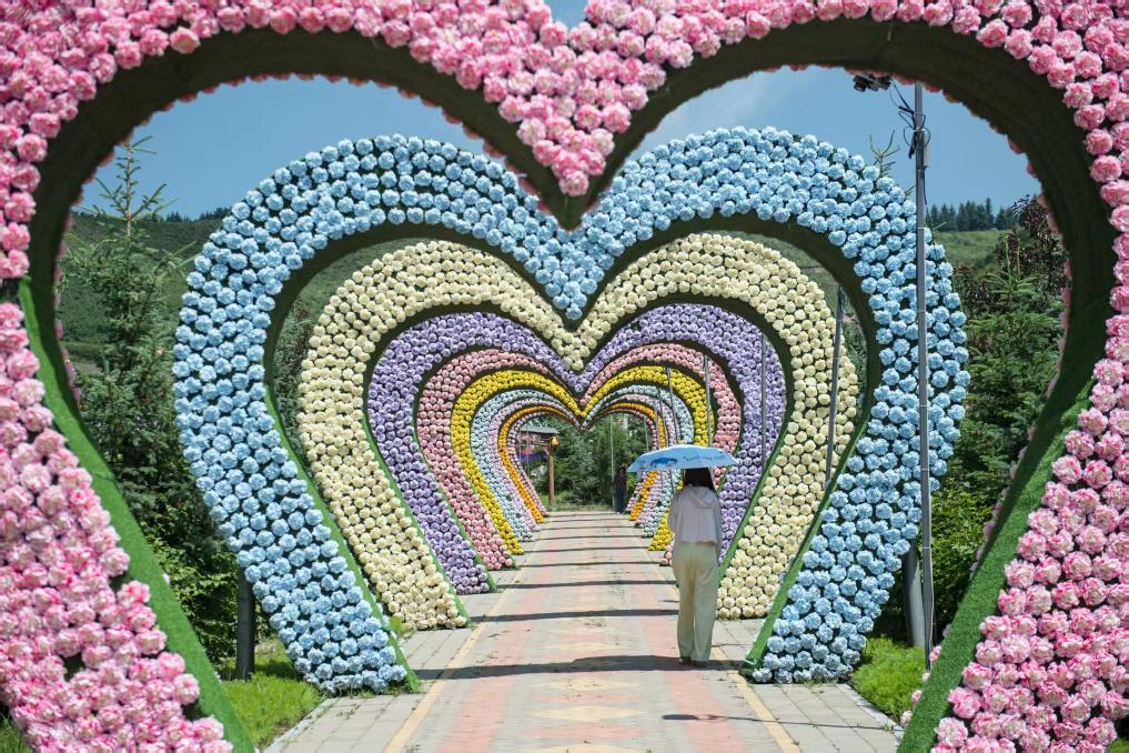 7月22日,在青海省大通縣邊麻溝花海景區(qū),一名游客經(jīng)過(guò)鮮花長(zhǎng)廊。新華社記者 孫瑞博 攝