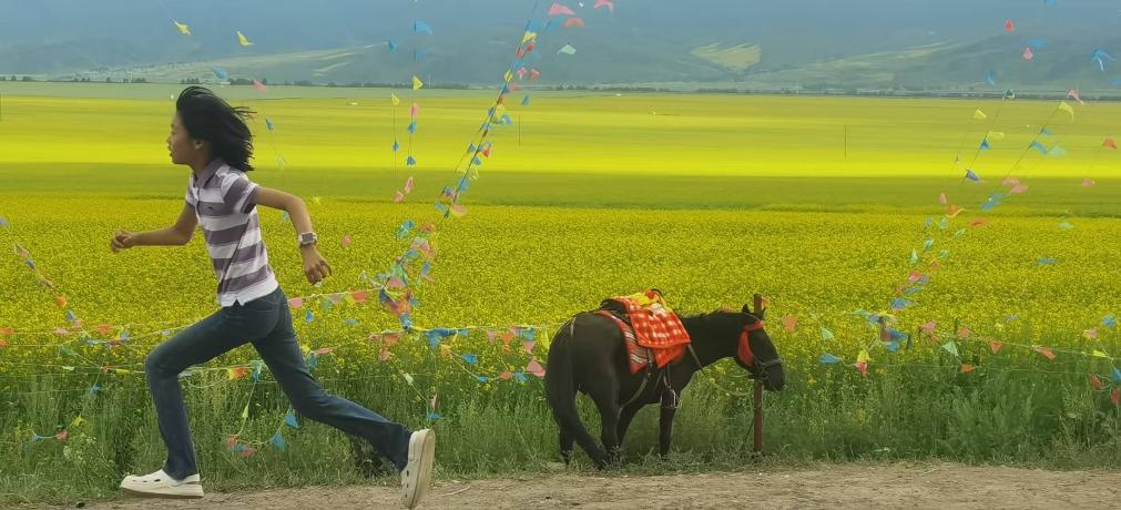 7月22日,抓拍到小游客在門(mén)源百里油菜花旁奔跑。新華社記者 古一平 攝