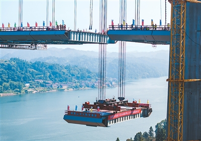 8月3日,由湖南路橋建設集團承建的張官高速控制性工程洞庭溪沅水特大橋主橋順利合龍,為2026年全線通車奠定堅實基礎。張官高速公路北起張家界市永定區,南至懷化市沅陵縣官莊鎮,是國家高速公路網呼和浩特—北海高速公路的重要組成部分。圖為大橋施工現場,一塊鋼混結合梁在被緩緩提升。新華社記者 陳思汗攝