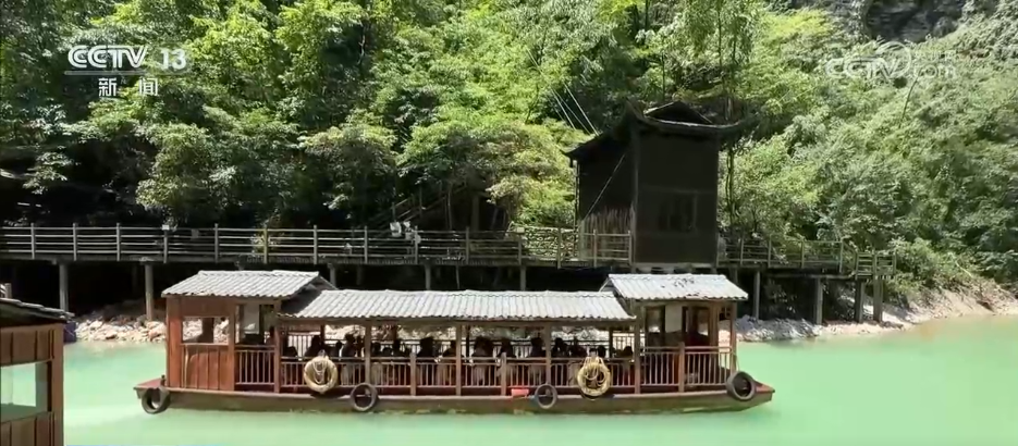 乘船賞景也成為景區一大特色,游客們乘坐游船緩緩穿梭于澄澈的湖面上,四周峽谷青山環抱,石壁瀑布傾瀉而下,兩岸景色蔚為壯觀。微風拂來,吹散夏日的燥熱,讓人沉浸在如詩如畫的美景中,心曠神怡。