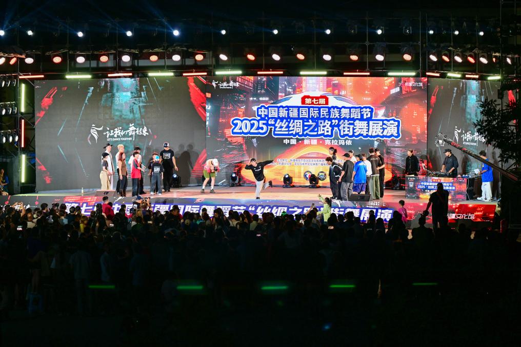 8月3日晚,在第七屆中國新疆國際民族舞蹈節2025“絲綢之路”街舞展演的舞臺上,國內外舞者相聚克拉瑪依市同臺亮相,用街舞語言講述追夢的青春故事。