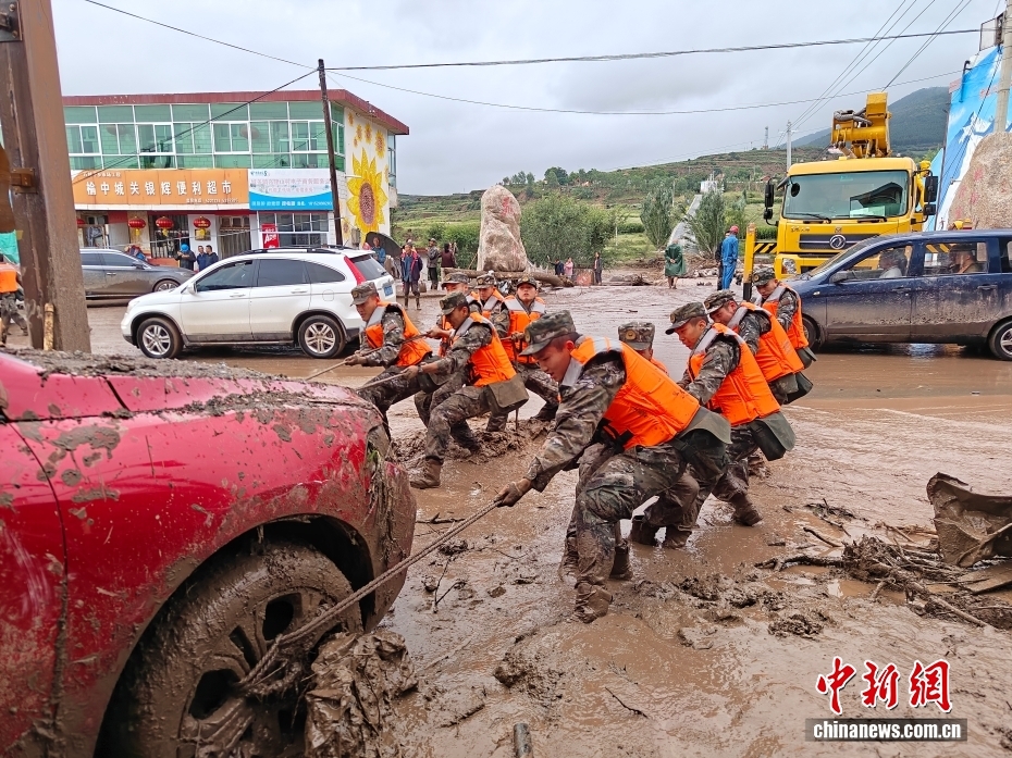 8月8日,武警甘肅總隊機(jī)動支隊官兵在甘肅省蘭州市榆中縣興隆山村轉(zhuǎn)移損壞車輛。劉昆 攝