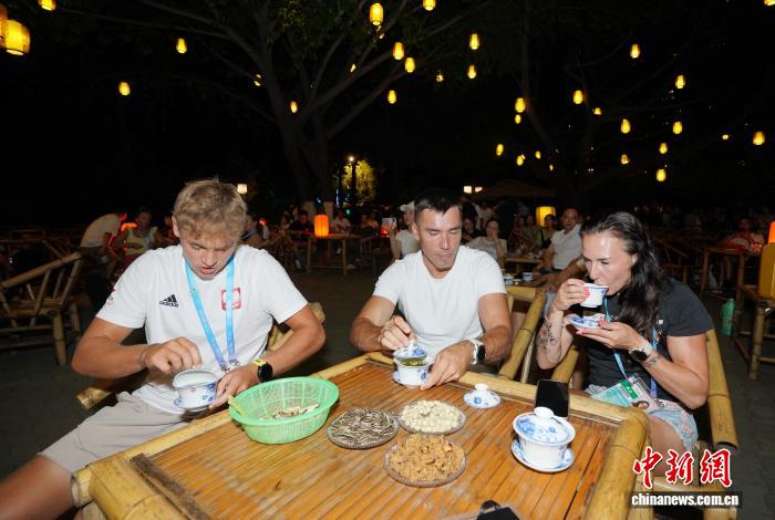 8月6日晚,成都世運會外籍運動員等在成都望江樓公園品成都蓋碗茶。 中新社記者 安源 攝