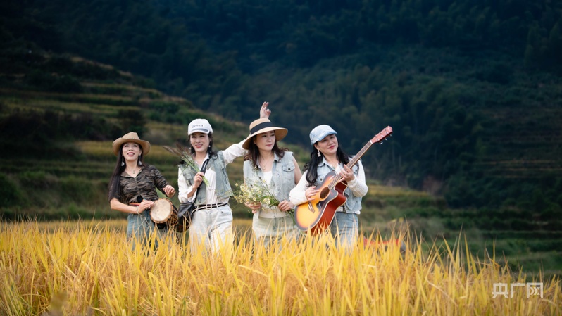 游客們手里的長(zhǎng)槍短炮對(duì)準(zhǔn)半山腰的梯田,咔嚓聲響個(gè)不停。航拍鏡頭下,沉甸甸的谷穗隨風(fēng)搖曳。幾名熱愛(ài)音樂(lè)的游客在梯田中央彈起吉他,驚飛成群白鷺,雪白的翅膀掠過(guò)湛藍(lán)晴空。