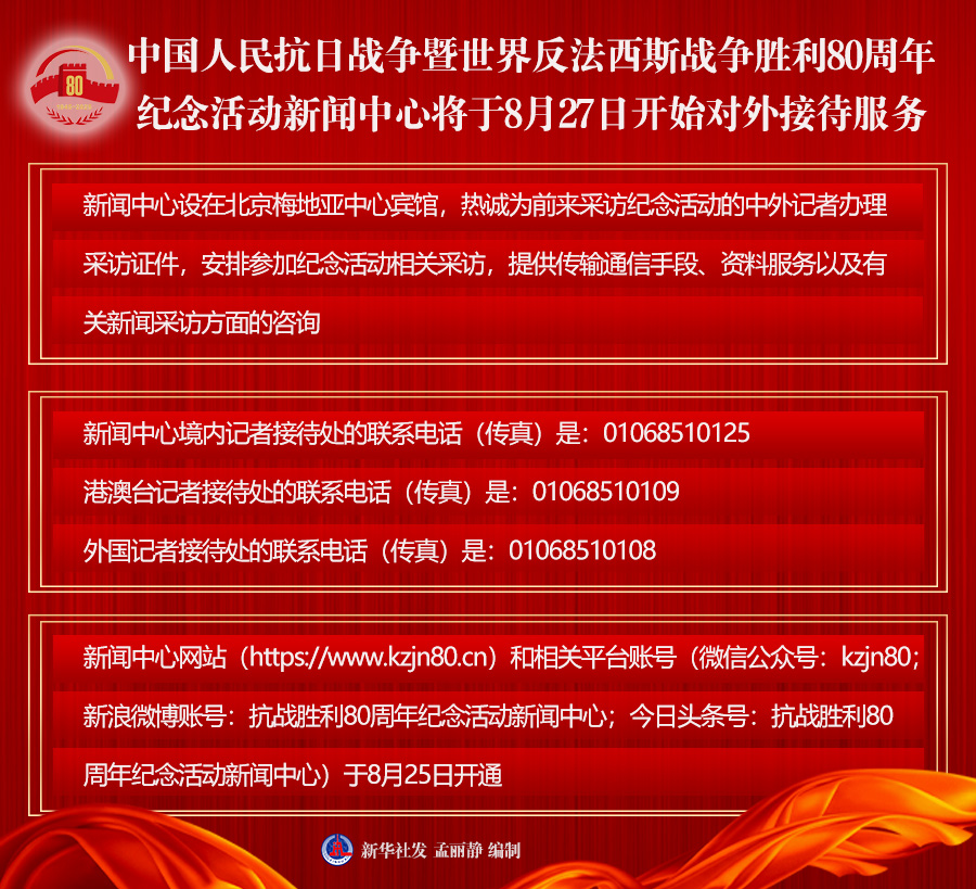 新聞中心網站(https://www.kzjn80.cn)和相關平臺賬號(微信公眾號:kzjn80;新浪微博賬號:抗戰勝利80周年紀念活動新聞中心;今日頭條號:抗戰勝利80周年紀念活動新聞中心)將于8月25日開通。