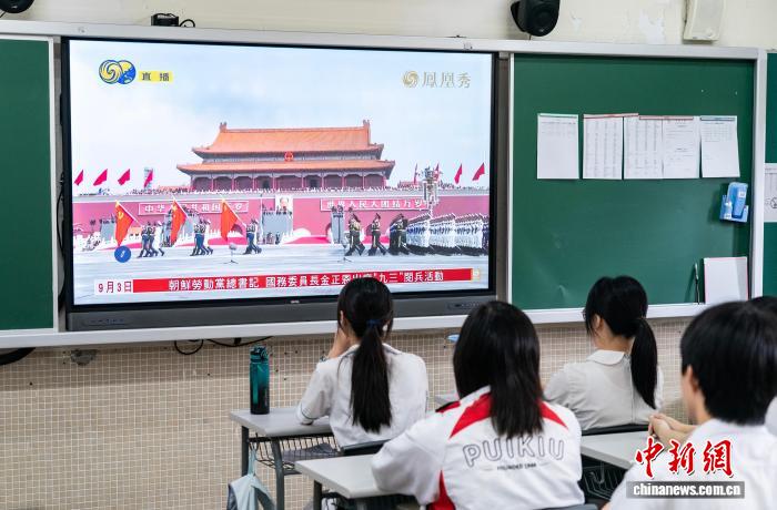 9月3日,香港培僑中學學生觀看紀念中國人民抗日戰爭暨世界反法西斯戰爭勝利80周年大會直播。中新社記者 侯宇 攝
