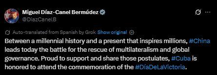迪亞斯-卡內爾在社交媒體上發文稱,“在綿延千年的歷史與激勵億萬人的當下之間,中國今日引領捍衛多邊主義與全球治理的斗爭。古巴為支持并踐行這些理念而自豪,并榮幸出席勝利日紀念活動。”