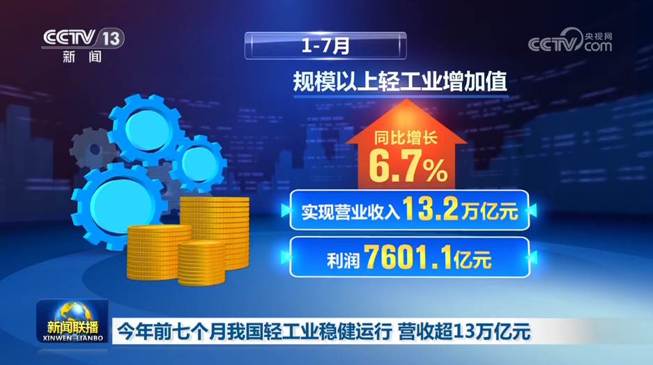 中國輕工業聯合會數據顯示,今年前七個月,在擴內需、促消費政策支持下,我國輕工業運行穩健,生產、營收、市場規模均保持良好態勢。規模以上輕工業增加值同比增長6.7%,實現營業收入13.2萬億元、利潤7601.1億元。