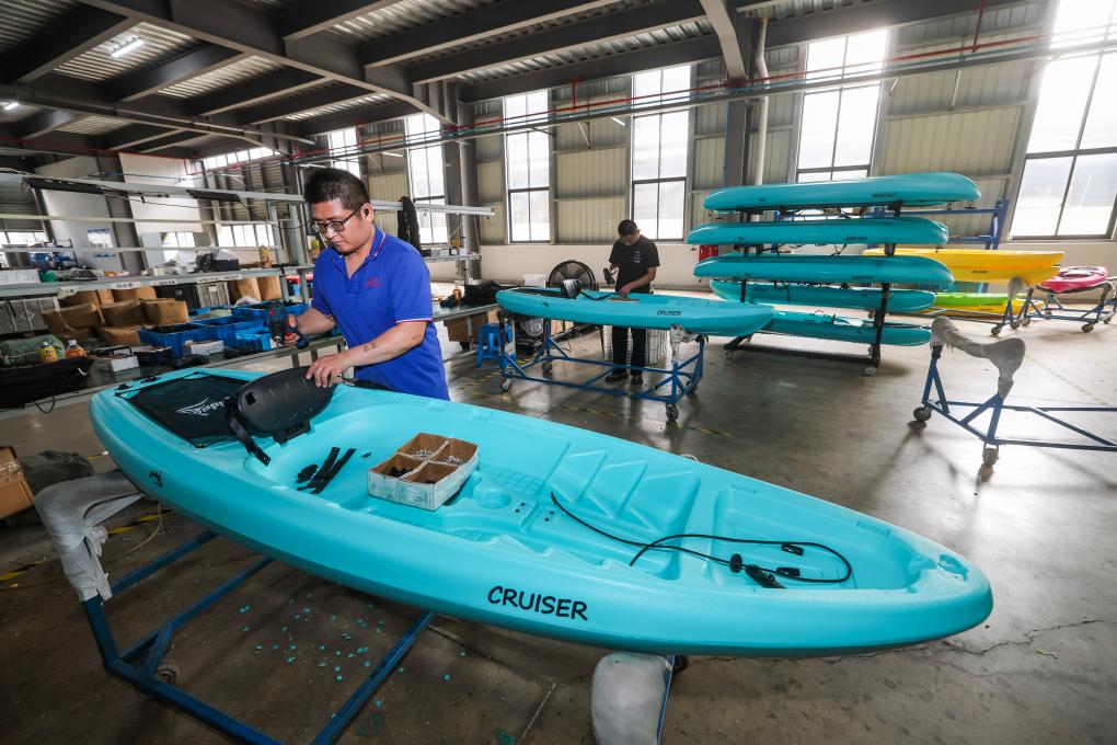 6月25日,在位于慈溪市的浙江酷爾智能科技有限公司的車間內,工人在加工出口的皮劃艇。新華社記者 徐昱 攝