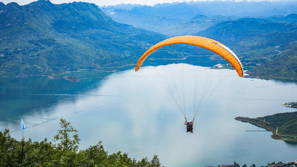 7月9日,游客在教練的陪同下體驗低空滑翔飛行。滑翔傘這一低空旅游項目成為了貴州省六盤水市眾多游客的新選擇。新華社記者 陶亮 攝