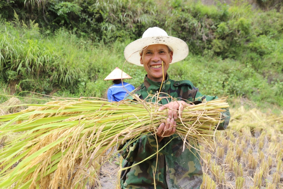 貴州省黔東南州鎮遠縣報京鄉的農戶展示稻穗,臉上洋溢著笑容(央廣網發 張佳怡 攝)