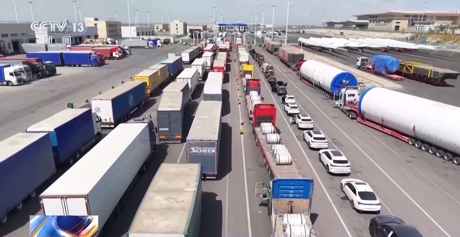 總臺央視記者 李廈:這里是霍爾果斯公路口岸,看我身邊龐大的車流,不僅有滿載跨境包裹的大貨車、更是有一眼望不到頭的國產新能源車和農用機械車輛,甚至還有長達數十米的風機葉片,這些琳瑯滿目的中國好貨,正在24小時不停歇地從這條黃金大通道駛出國門。