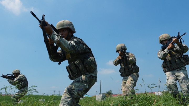 烈日灼人,汗水混雜著泥土粘在作訓服上。但戰士們一絲不茍,目光如炬,動作凌厲,搜索、突擊、越障、匍匐……一舉一動彰顯著人民軍隊的凜然軍威與中國軍人的過硬本領。?
