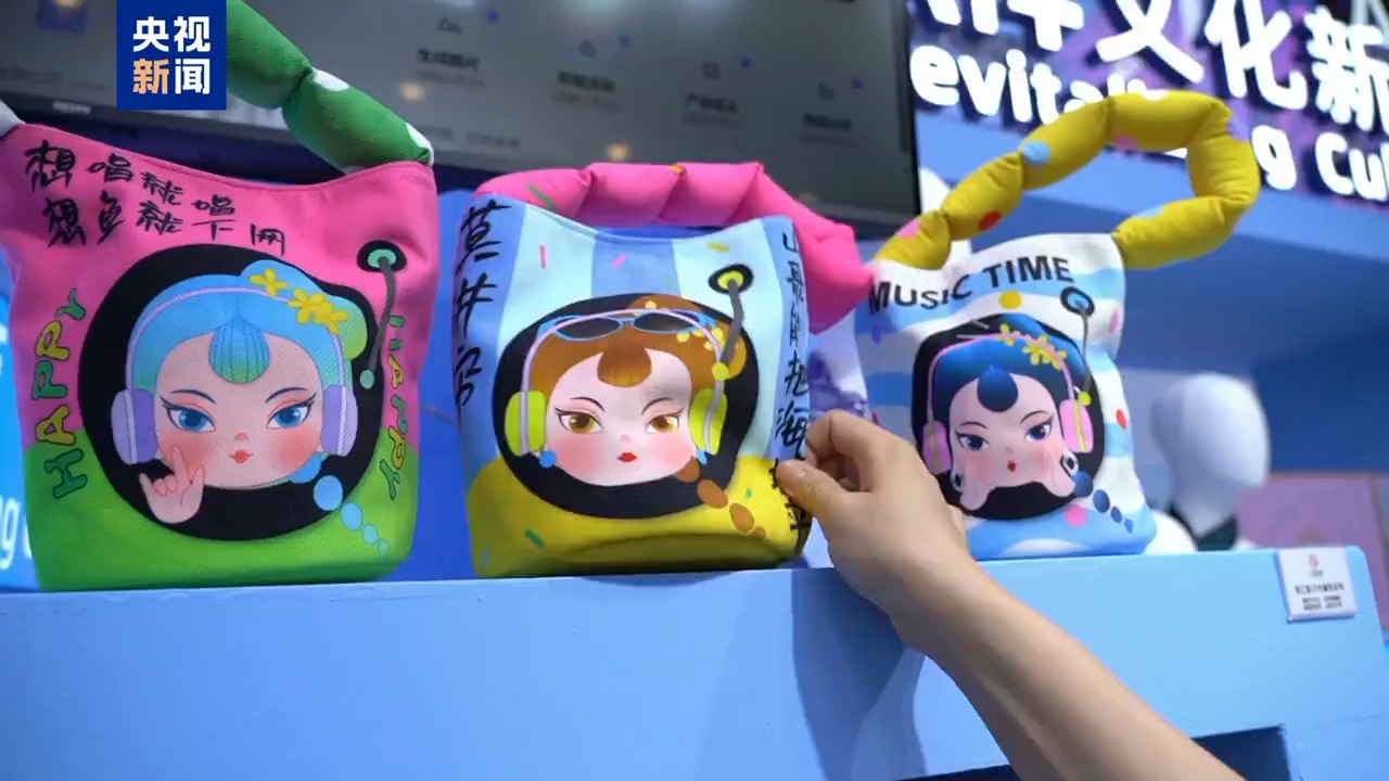 總臺央視記者 張歆:在人工智能專館,除了有炫酷的機器人,我們可以看到,這個水桶包就是由人工智能提供靈感的,以劉三姐為IP形象的文創產品。那么這個水桶包還引用了劉三姐山歌的內容,“山歌能把海填平”。