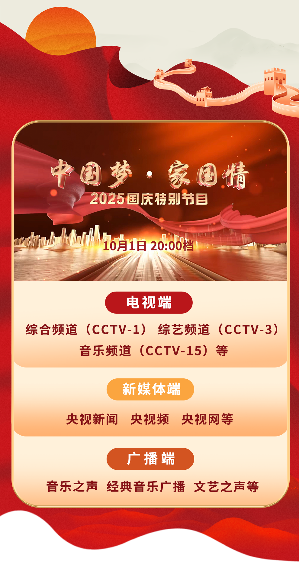金秋潑彩山河醉,家國同輝氣象新。10月1日晚八點,《中國夢 家國情——2025國慶特別節(jié)目》將在《我愛你中國》的大合唱中拉開大幕。特別節(jié)目走進城市地標與文化遺址,展現(xiàn)山河新貌與奮斗者群像。經(jīng)典曲目、交響合唱、新創(chuàng)歌曲傳遞濃濃家國情懷。抗戰(zhàn)老兵、奧運冠軍、各行各業(yè)奮斗者深情講述……整場節(jié)目,洋溢著中華民族偉大復(fù)興勢不可擋的壯志豪情。