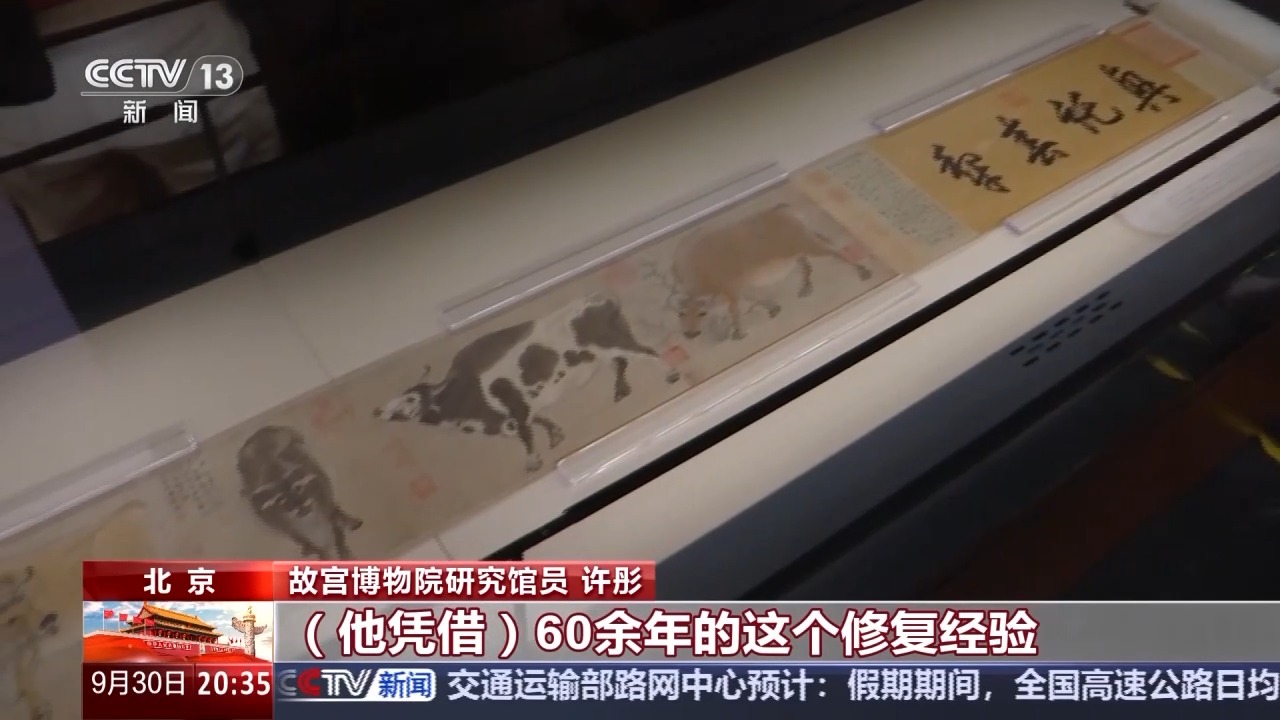 故宮博物院研究館員 許彤:它上面大小破洞應該有300多處,非常殘破。后來,修復專家孫承枝老師憑借其60余年的修復經驗,通過揭裱、修補、全色又重裝,最終讓國寶重光,獲得新生。