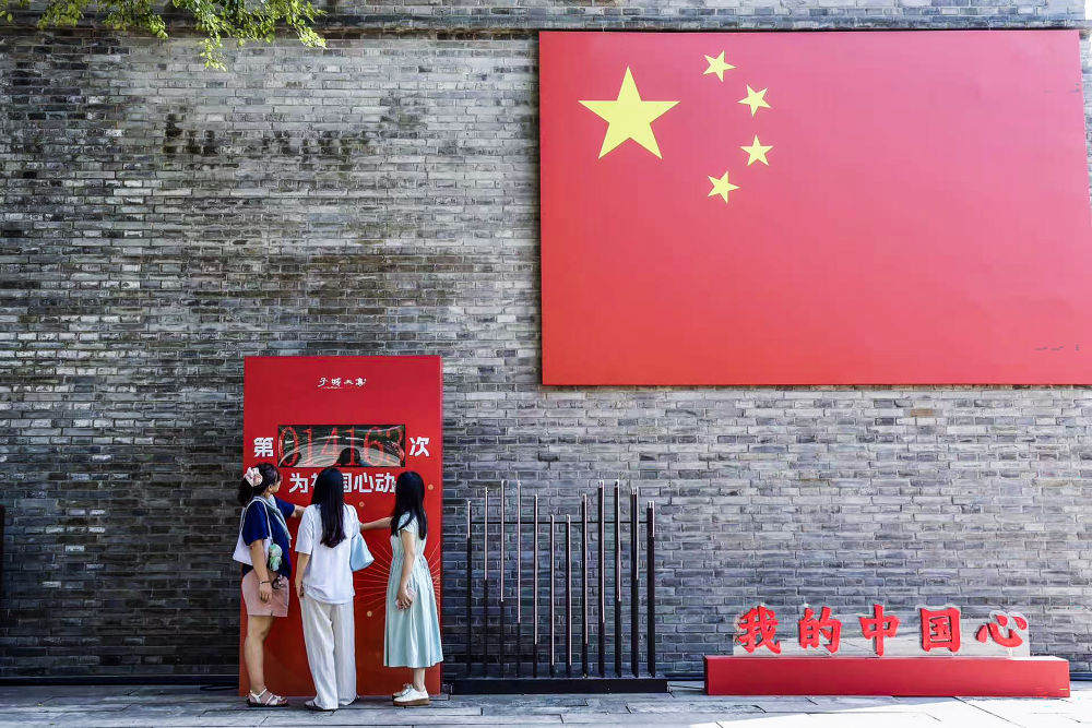 10月1日,在浙江嘉興市南湖區(qū)建設(shè)街道子城城墻邊,市民參加我為祖國心動(dòng)打卡活動(dòng)。新華社記者 徐昱 攝