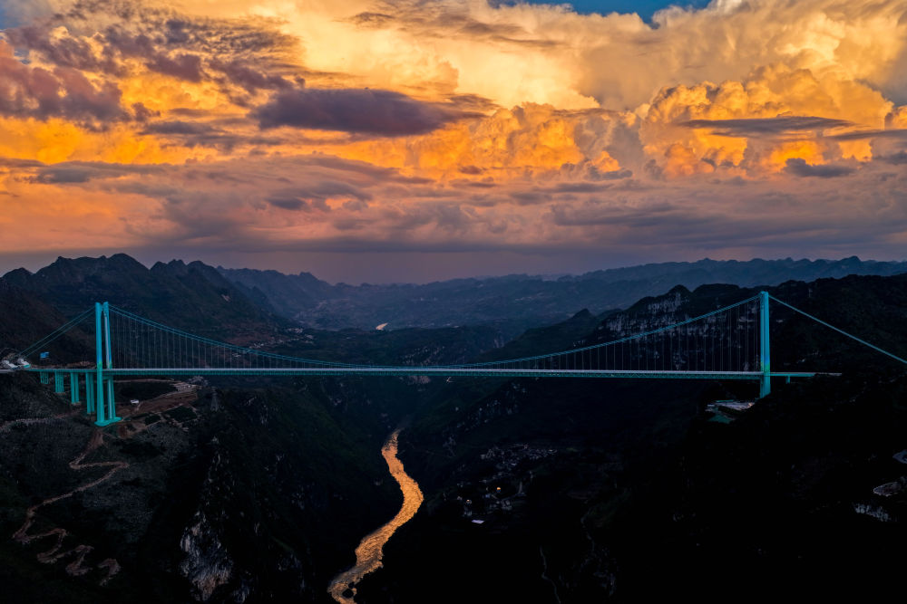 這是9月28日拍攝的夕陽下的貴州花江峽谷大橋(無人機照片)。新華社記者 楊文斌 攝