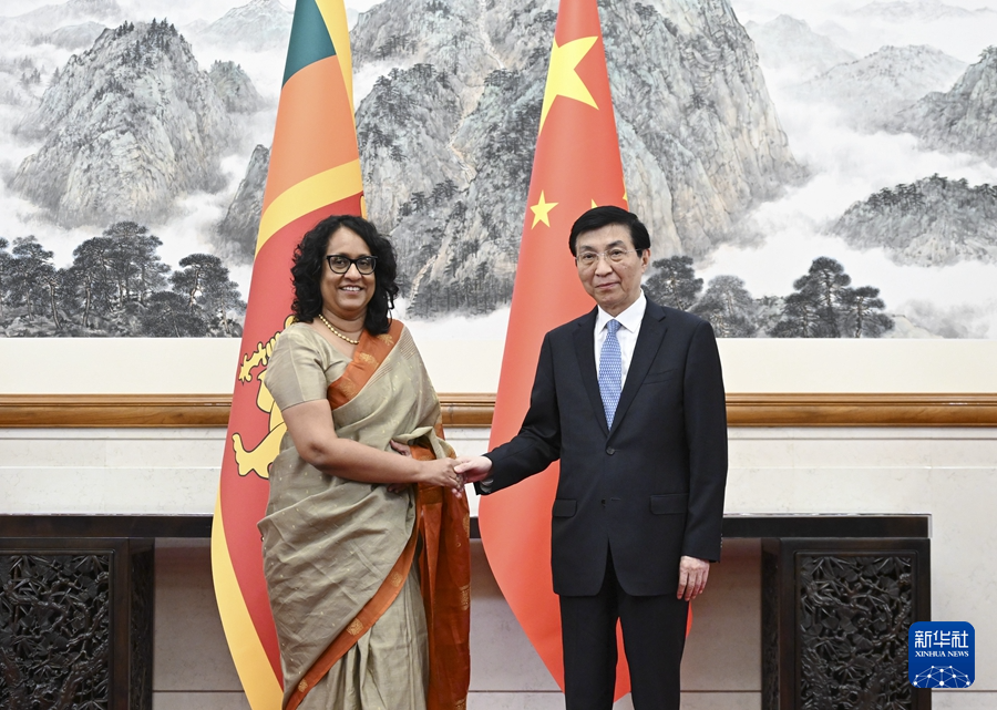 全國政協主席王滬寧13日在京會見來華出席全球婦女峰會的斯里蘭卡總理阿馬拉蘇里亞。