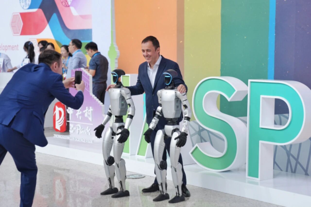 2025年9月17日,國際科技園及創新區域協會(IASP)2025年世界大會在北京國家會議中心開幕。圖為外籍嘉賓在大會現場同機器人合影。中新社記者 張祥毅 攝
