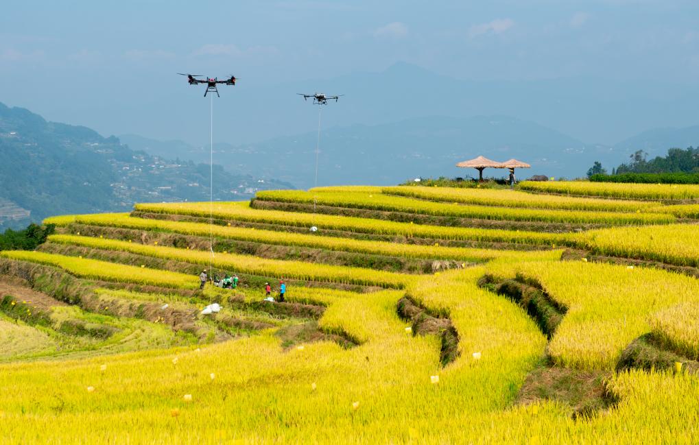 10月10日,湖北省秭歸縣沙鎮溪鎮長春村村民用無人機轉運收獲的水稻(無人機照片)。新華社發(雷勇攝)