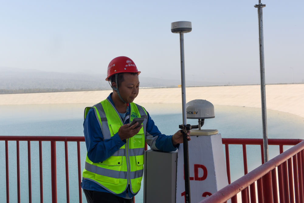 ↑ 11月1日,施工人員在奧吞勒克水庫檢查閘控系統設備試運行情況。