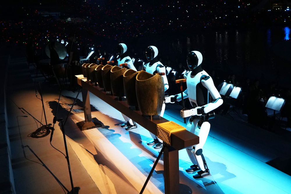 11月9日,開幕式上的工業人形機器人敲響千年前的中國古代樂器青銅句鑃。新華社記者 李一博 攝