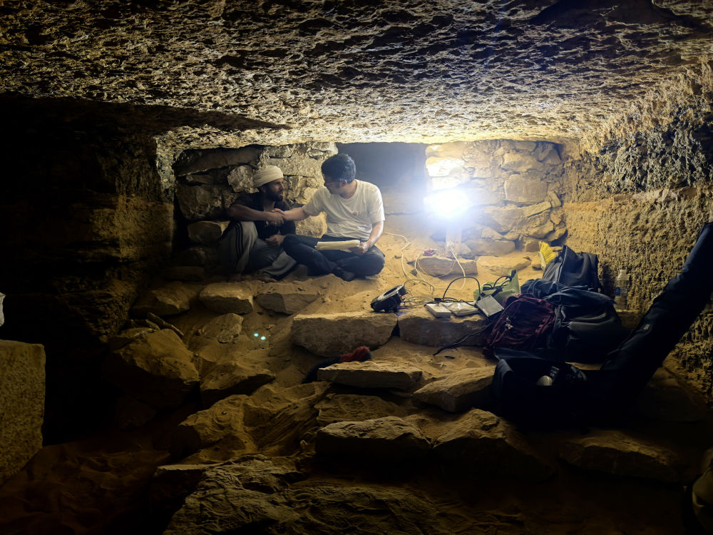 9月16日,在埃及開羅以南的薩卡拉考古遺址區,中埃薩卡拉聯合考古項目中方領隊薛江(右)和埃方同行在一座貴族墓內工作。(受訪者供圖)