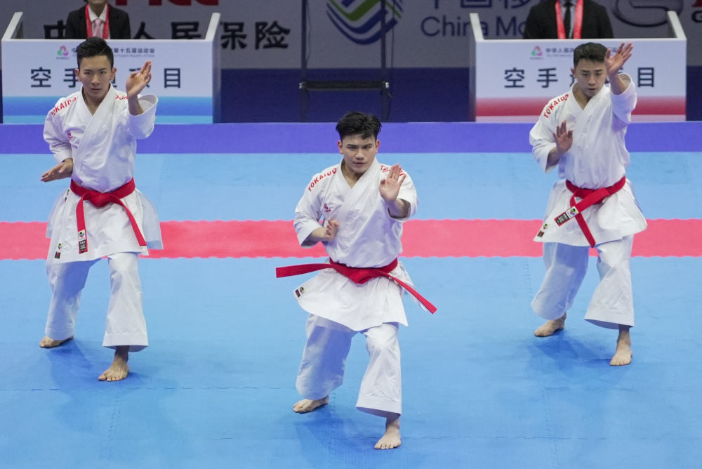 2025年11月6日,澳門代表隊(duì)在澳門舉行的第十五屆全國運(yùn)動(dòng)會(huì)群眾比賽項(xiàng)目空手道男子業(yè)余組團(tuán)體型半決賽中。新華社發(fā)