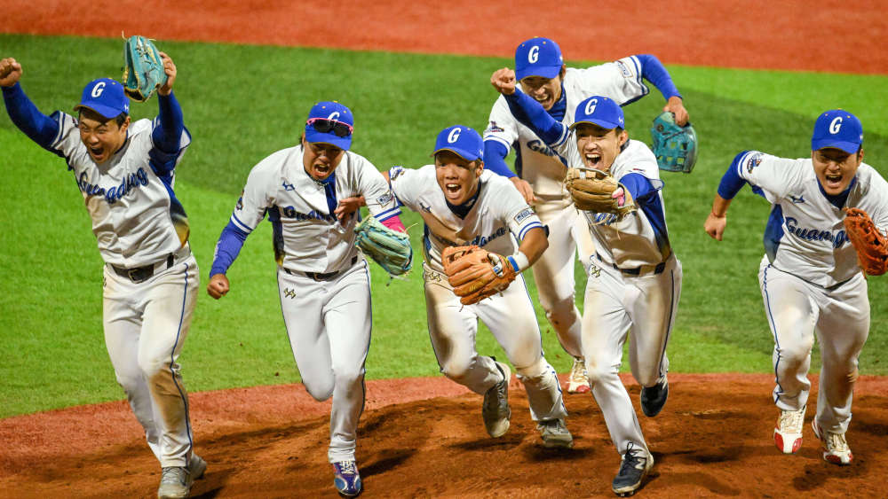 2025年11月19日,廣東隊(duì)球員在廣東中山舉行的第十五屆全國運(yùn)動(dòng)會(huì)棒球1-4名交叉賽后慶祝勝利。新華社記者 丁磊 攝