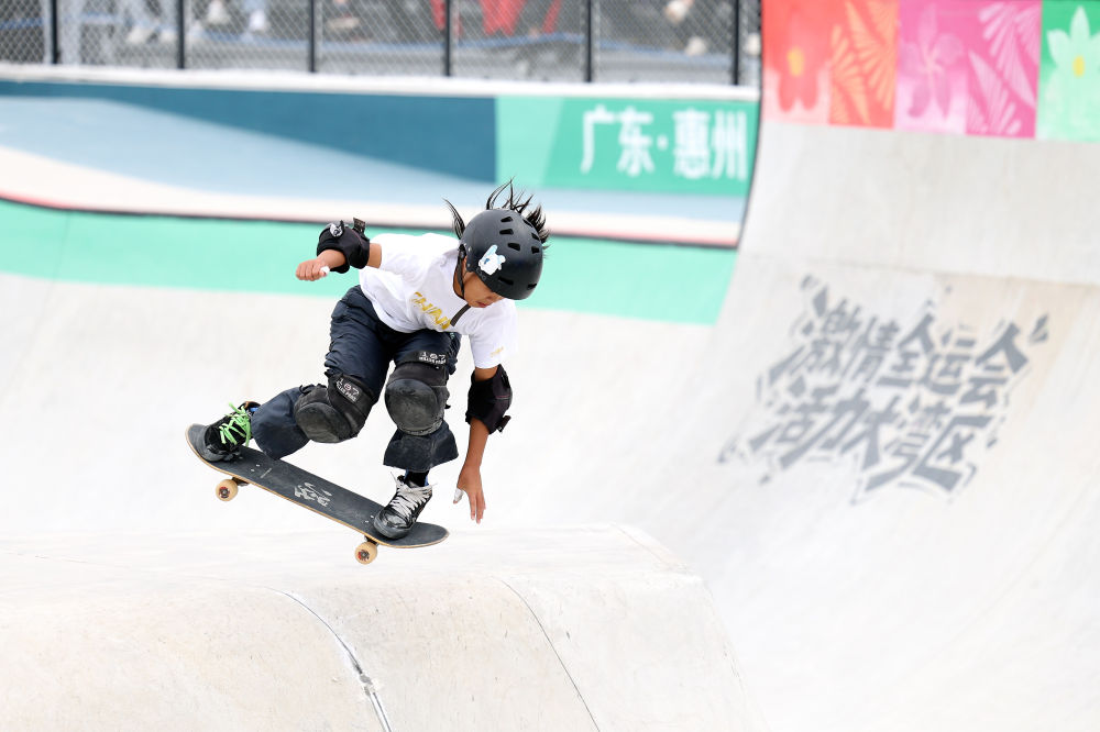 2025年11月11日,廣東隊(duì)選手鄒明珂在廣東惠州舉行的第十五屆全國運(yùn)動(dòng)會(huì)滑板項(xiàng)目女子碗池賽決賽中。新華社記者盧漢欣攝