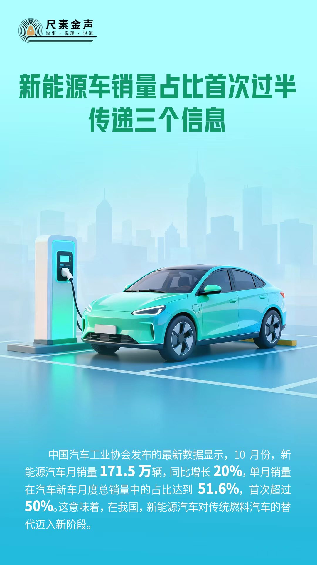 中國汽車工業協會發布的最新數據顯示,10月份,新能源汽車月銷量171.5萬輛,同比增長20%,單月銷量在汽車新車月度總銷量中的占比達到51.6%,首次超過50%。這意味著,在我國,新能源汽車對傳統燃料汽車的替代邁入新階段。