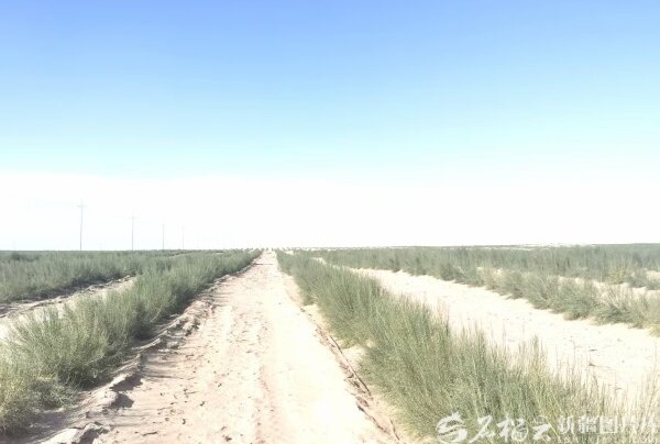 今年3月在沙雅縣蓋孜庫木鄉沙漠邊緣種植的2.5萬畝梭梭林,已形成約5公里寬的綠色防護帶。石榴云/新疆日報記者 曹華攝