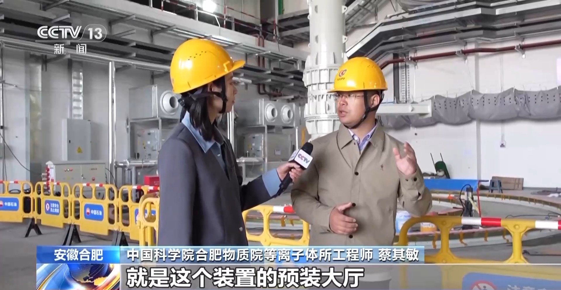 中國科學院合肥物質院等離子體所工程師 蔡其敏:在“十四五”期間,合肥科學島的EAST(東方超環)裝置上面突破了億度千秒大關,推動核聚變研究從基礎的實驗領域轉向了工程化的建設。我們現在所處的位置就是這個裝置的預裝大廳,目前我們是在緊鑼密鼓地建設這個園區。