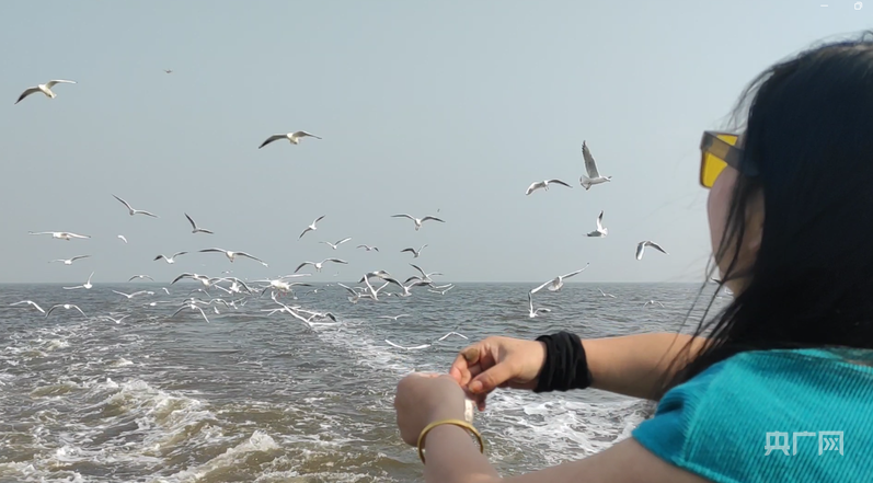 游客在漁船上喂海鷗(央廣網見習記者 安適存 攝)