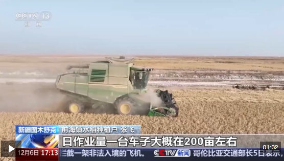 前海鎮水稻種植戶 張飛:一臺車子日作業量在200畝左右,4000畝水稻大概在10天到15天之內能采收完畢。
