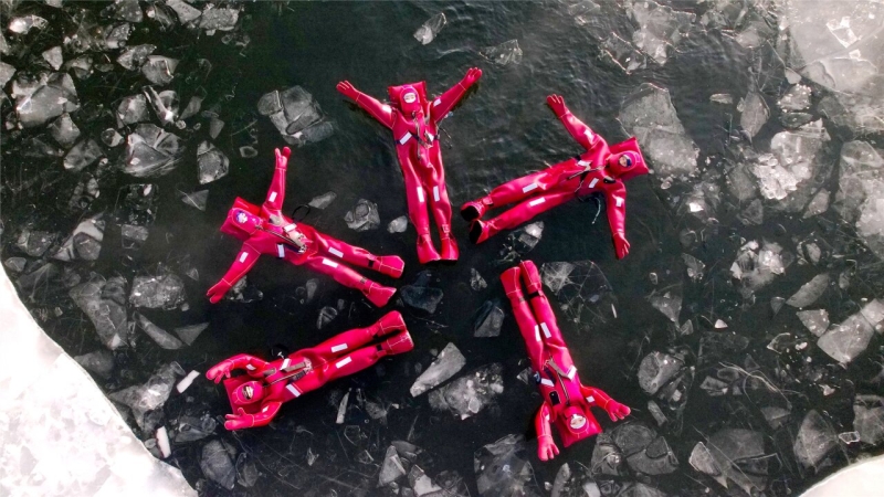 12月5日,在阿勒泰市阿葦灘鎮,不少游客身著紅色特制防寒服,在阿勒泰冰浮俱樂部體驗冰浮項目。張福新攝