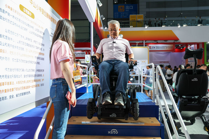 2025年9月12日,在2025深圳國際智慧養老產業博覽會上,觀眾在展會現場體驗一款可以上下樓梯的智能出行機器人。新華社記者 梁旭 攝