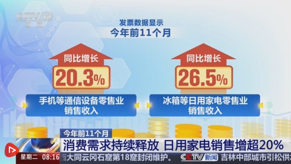 發(fā)票數(shù)據(jù)顯示,2025年前11個(gè)月,手機(jī)等通信設(shè)備零售業(yè)、冰箱等日用家電零售業(yè)銷售收入同比分別增長20.3%、26.5%。新能源汽車消費(fèi)也持續(xù)向好,新能源乘用車銷售收入同比增長19.1%。同時(shí),文旅市場新業(yè)態(tài)新場景不斷涌現(xiàn),激發(fā)消費(fèi)活力持續(xù)增強(qiáng)。