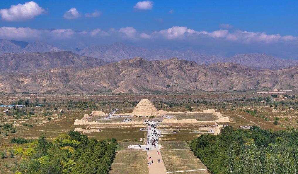 2025年10月2日,游客在西夏陵遺址區參觀三號陵(無人機照片)。新華社記者 馮開華 攝