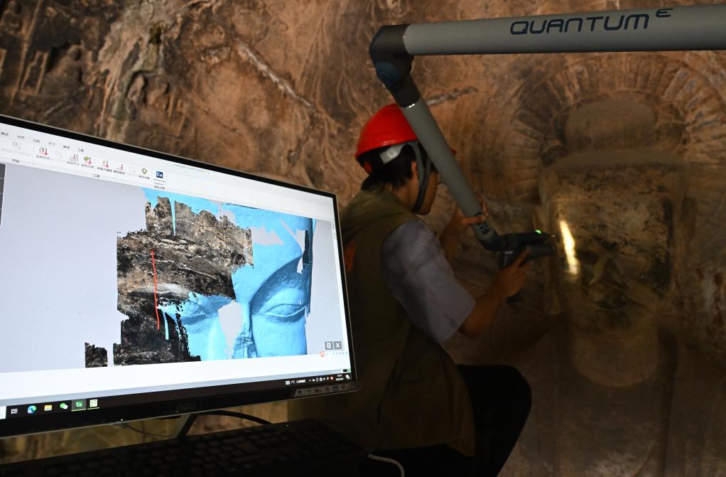 2025年4月9日,武漢大學文化遺產智能計算實驗室團隊成員在魏字洞使用關節臂掃描儀對佛像進行數字化掃描。新華社記者 李嘉南 攝