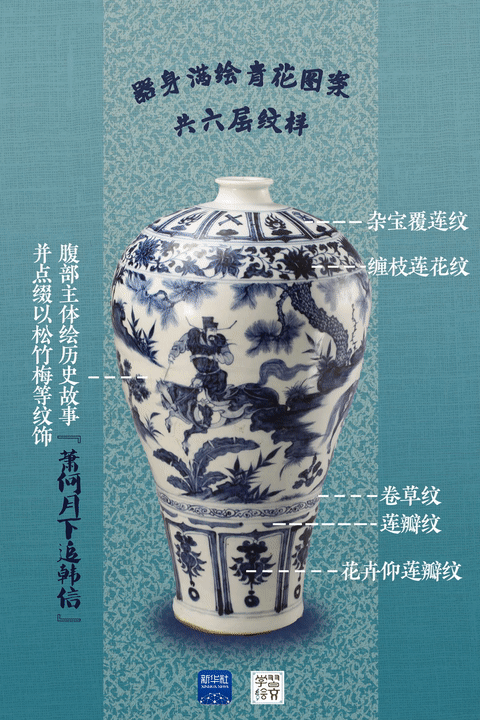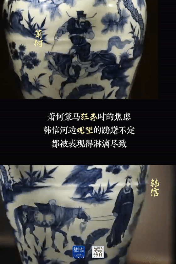 “元代是中國陶瓷史上不容忽視的重要時期。”宋燕介紹,這件藏于南京市博物館的元青花蕭何月下追韓信圖梅瓶向人們展示了元代制瓷水平。
