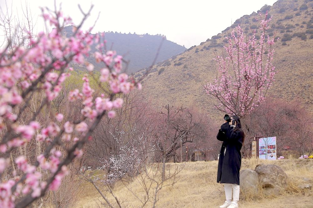 游客在嘎拉村賞花游玩,拍攝盛開的桃花。新華社記者 邱星翔 攝