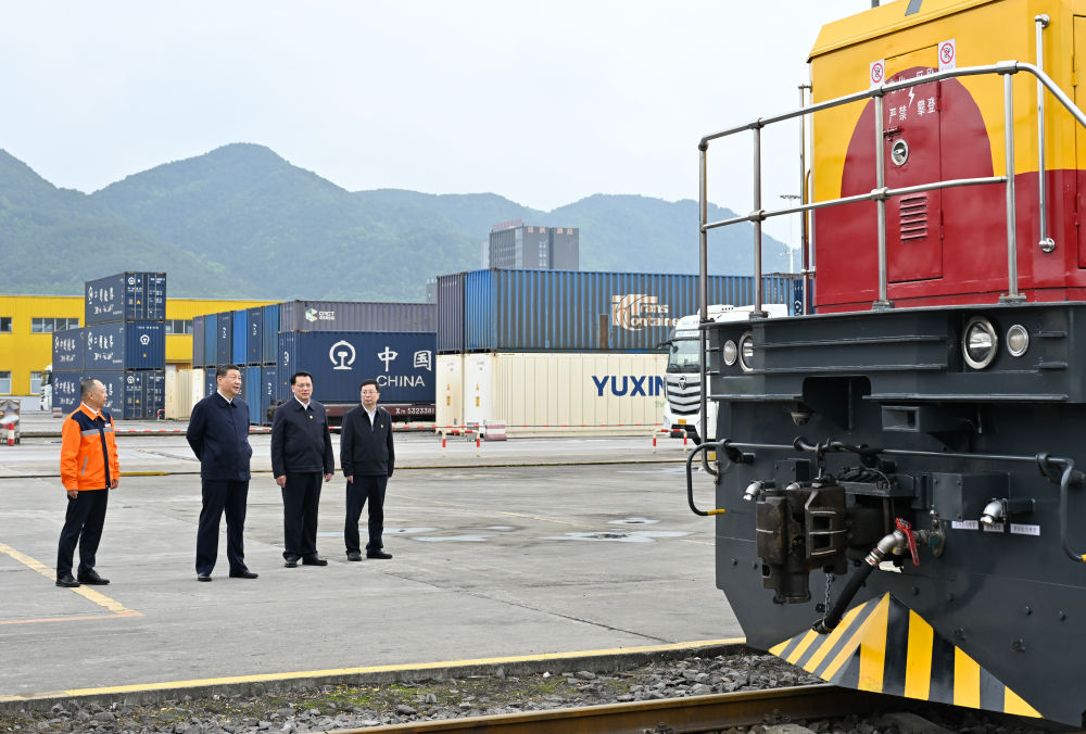 這是4月22日,習近平在重慶國際物流樞紐園區,了解當地加快建設西部陸海新通道等情況。