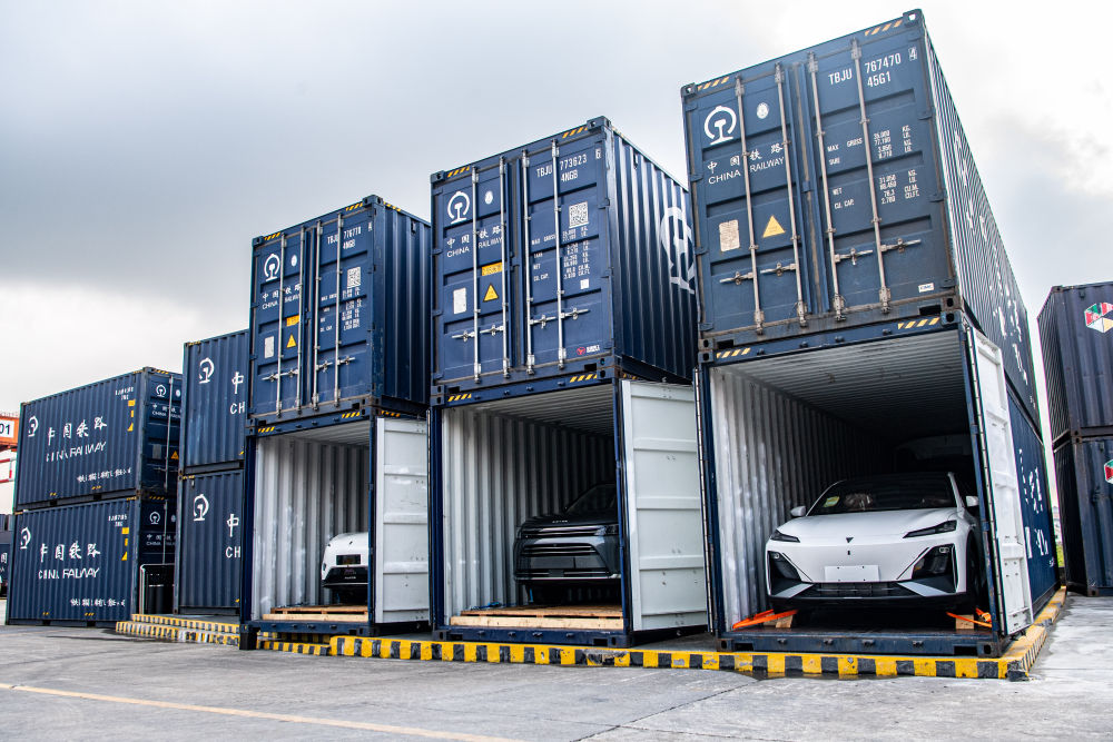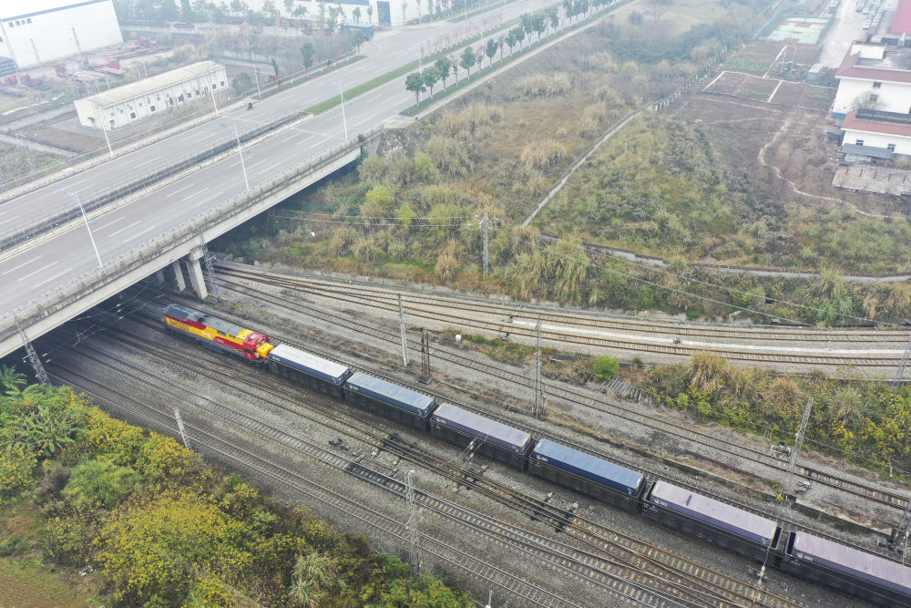 2023年1月22日,一趟西部陸海新通道鐵海聯運班列從重慶團結村中心站發車(無人機照片)。班列滿載著汽車、摩托車、發動機和純堿等共計100個集裝箱的貨物,將經廣西欽州港換乘海船去往印度尼西亞、菲律賓、喀麥隆、澳大利亞等國家和地區。