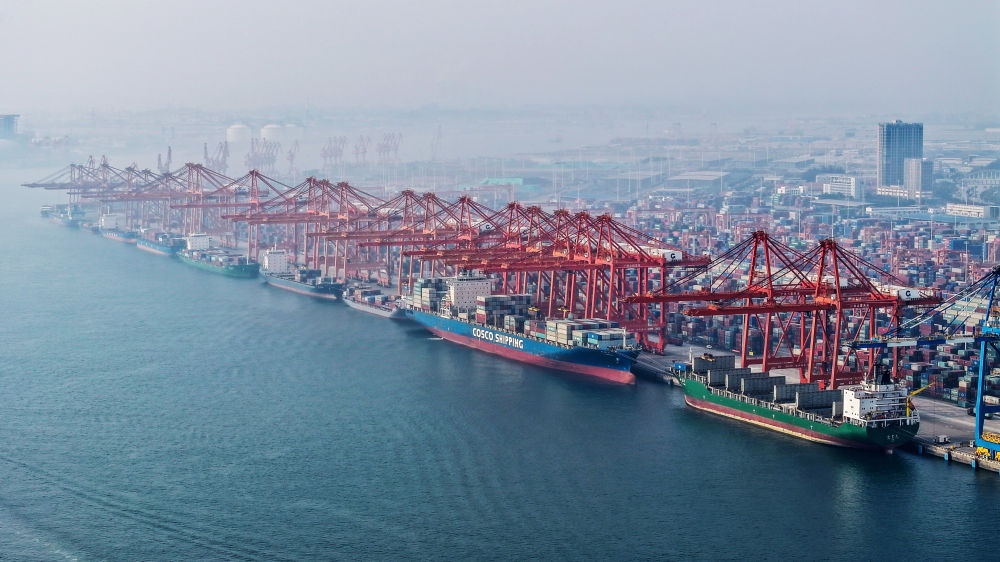 2024年3月28日,在廣西欽州港碼頭,多艘海輪在排隊卸貨(無人機照片)。據統計,截至3月29日,今年西部陸海新通道鐵海聯運班列運輸集裝箱貨物20.03萬標箱,同比增長7.2%。
