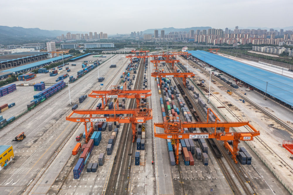 如今,“四向”物流通道在這里交匯:向西,中歐班列直達歐洲多國;向東,渝甬班列直抵寧波舟山港;向北,“渝滿俄”班列開行;向南,西部陸海新通道直達廣西欽州港,再通往世界多個國家和地區……