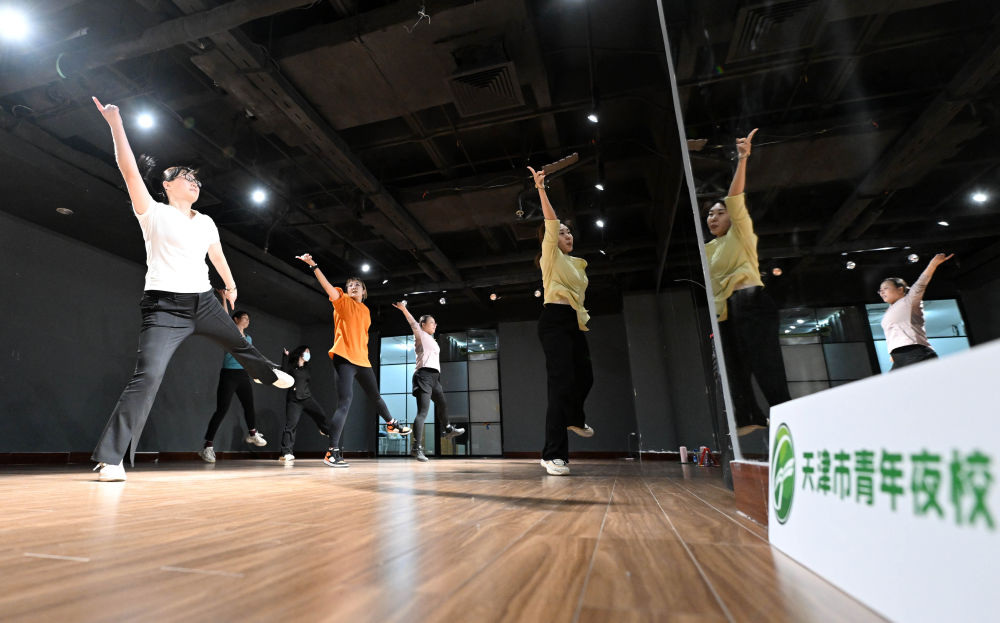 在天津青年宮,學員在青年夜校練習有氧健身舞(2024年4月23日攝)。 新華社記者 趙子碩 攝