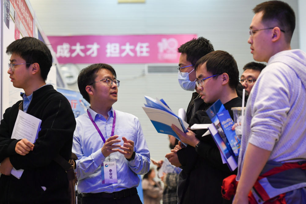 在清華大學舉辦的2024屆畢業生大型就業洽談會上,一名用人單位招聘人員(左二)與求職畢業生交流(2024年3月15日攝)。新華社記者 鞠煥宗 攝